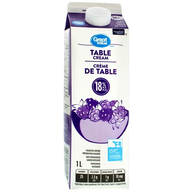 Quality meets affordability with Great Value 18% M.F Table Cream. Manufactured to deliver consistent results, this cream is ideal for both home cooks and professional chefs. Its 18% milk fat content delivers a satisfying richness without being overly heavy, making it versatile for a wide array of recipes. Plus, its convenient 1 L packaging ensures you have enough cream on hand for all your cooking needs, reducing frequent trips to the store.