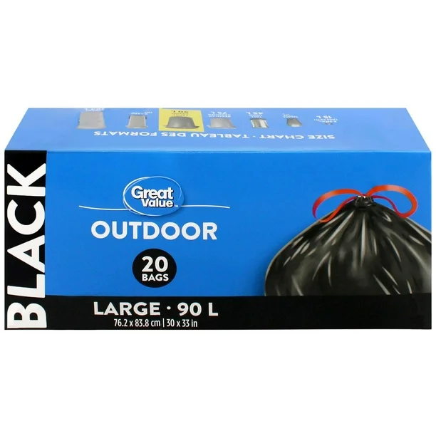 Say goodbye to flimsy garbage bags and embrace the strength of Great Value Large Outdoor Garbage Bags, measuring 76.2 x 83.8 cm. Designed for outdoor use, these heavy-duty bags are perfect for tackling even the toughest trash collection challenges. Whether you’re cleaning up your yard, organizing an outdoor event, or handling large amounts of waste, these bags provide the durability and reliability you need to get the job done.