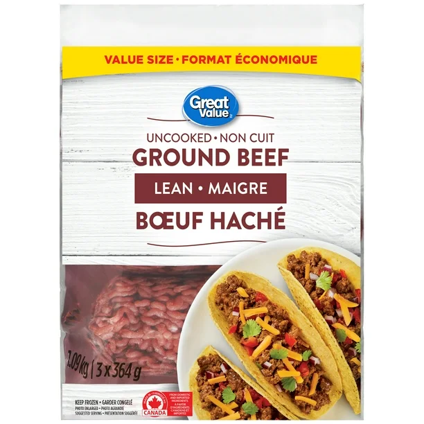 Great Value Lean Ground Beef is your ideal choice when you want a high-quality protein source that delivers both taste and nutrition. With a total weight of 1.09 kg, conveniently divided into three 364 g packages, this product is designed for flexibility in meal preparation. Whether you’re crafting juicy burgers, flavorful meatballs, or hearty casseroles, our lean ground beef is perfect for countless recipes. Its consistent freshness and superior quality make it a reliable addition to your kitchen.