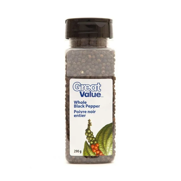Experience the robust and aromatic taste of Great Value Whole Black Pepper, 290 g, a must-have for every kitchen. Whether you’re crafting complex recipes or seasoning simple dishes, this black pepper adds a depth of flavor and a touch of spice that complements any meal. Perfect for home cooks and food enthusiasts alike, its freshness and quality ensure that every dish is elevated.