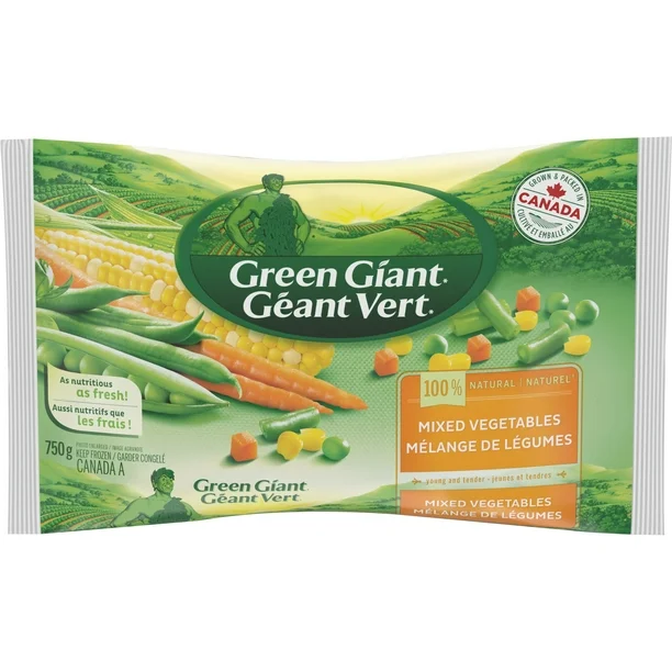 Experience the convenience and quality of Green Giant 100% Natural Mixed Vegetables. Perfectly grown and packed in Canada, this blend of frozen vegetables guarantees farm-fresh flavor and nutrition whenever you need it. No matter your cooking style, these vegetables are ready to complement any dish while saving you time in the kitchen.