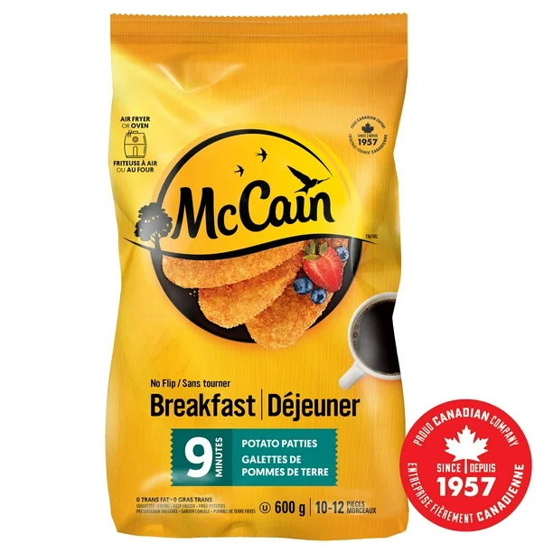 Discover the ultimate convenience with McCain® 9 Minute No Flip Potato Patties, crafted to make your life easier in the kitchen. These golden, crispy potato patties are expertly made in Canada using a blend of domestic and imported ingredients, ensuring maximum taste and quality in every bite. Perfect for breakfast, lunch, or a simple side dish, these patties are designed to cook in just nine minutes without the hassle of flipping, so you can focus on enjoying your meal.