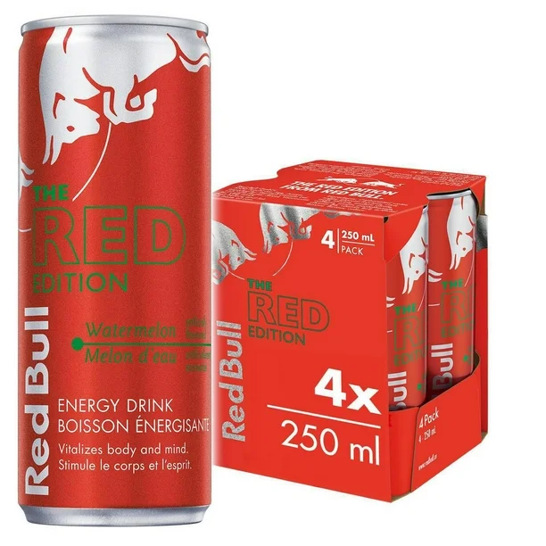 The Red Bull Watermelon Energy Drink comes in a pack of four conveniently sized 250ml cans. These compact cans are easy to carry in your bag or store in your fridge, ensuring your energy boost is always within reach. Plus, the multipack format allows you to share with friends or stock up for days when you need a little extra drive.